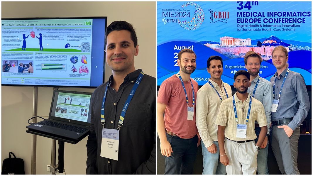Alexander Brenner, Yannik Warnecke, Michael Fujarski und Julian Varghese vom Institut für Medizinische Informatik der Universität Münster ist bei der diesjährigen Konferenz „Medical Informatics Europe“ (MIE) in Athen der Preis für das beste Poster zuerkannt worden. Der Titel des ausgezeichneten Posters lautet „Mixed Reality in Medical Education – Introduction of a Practical Course Module“. Dabei geht es um die erfolgreiche Einführung von Mixed Reality-Technologien in der medizinischen Lehre, welche das Einblenden von digitalen Inhalten in die reale Welt und eine intuitive Interaktion von realen und virtuellen Objekten ermöglichen. Vor dem Hintergrund einer zunehmenden Digitalisierung besteht ein wachsendes Potenzial für den Einsatz von Mixed Reality (MR) in der Medizin. Zukünftige Ärztinnen und Ärzte sollten mit den Möglichkeiten und Techniken von MR vertraut gemacht werden. Deshalb wurde an der Medizinischen Fakultät der Universität Münster ein neuer Kurs entwickelt, um Medizinstudierenden praktische Erfahrungen mit MR zu vermitteln. Dafür programmierte das Forschungsteam eine App für das MR-Headset HoloLens 2, die das gemeinsame Betrachten, Bewegen und Zeigen von verschiedenen anatomischen (Herz-)modellen erlaubte. In praktischen Aufgaben sollten die Studierenden entsprechende Krankheitsbilder oder anatomische Strukturen wie Koronar-Arterien anhand der Modelle beschreiben und darstellen. Zum Abschluss diskutierten die Studierenden ihre Eindrücke sowie Vor- und Nachteile der Technologie.