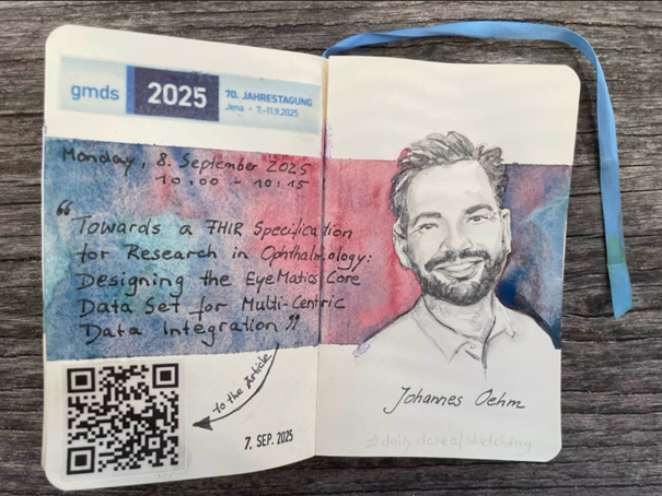 Auch Johannes Oehm aus dem MeDIC-Team trug mit einem Vortrag zum wissenschaftlichen Programm bei. Unter dem Titel „Towards a FHIR Specification for Research in Ophthalmology: Designing the EyeMatics Core Data Set for Multi-centric Data Integration“ berichtete er über die Entwicklung eines einheitlichen Kerndatensatzes für die Augenheilkunde im Rahmen des Forschungsprojekts EyeMatics. Ziel ist es, mithilfe des internationalen FHIR-Standards (Fast Healthcare Interoperability Resources) Forschungsdaten aus verschiedenen Kliniken besser vergleichbar und standortübergreifend nutzbar zu machen.