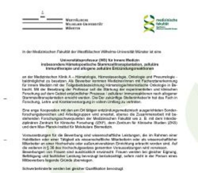 Die „Universitätsprofessur (W3) für Innere Medizin, insbesondere Hämatopoetische Stammzelltransplantation, zelluläre Immuntherapie und allogene zelluläre Entzündungsreaktionen“ soll die experimentelle und klinische Forschung auf dem Gebiet entzündlicher Prozesse und zellulärer Immunreaktionen nach allogener Stammzelltransplantation stärken. Als Bewerber kommen Mediziner/innen mit Facharztanerkennung für Innere Medizin mit der Teilgebietsbezeichnung Hämatologie/lnternistische Onkologie in Betracht.