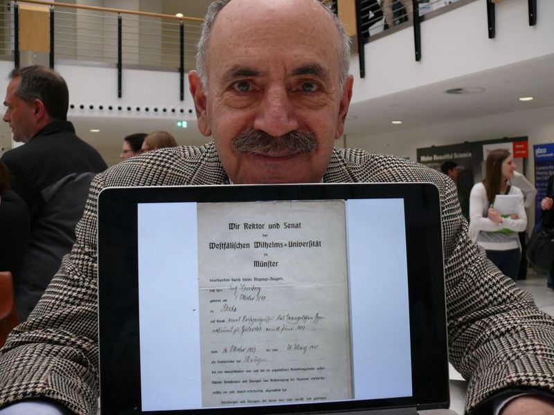 Ein Bild der historischen Urkunde hat er immer dabei: Prof. Robert Weinberg – hier während eines Kongresses der Universität Münster - zeigt stolz das Zeugnis, das die Hochschule seinem Vater vor 97 Jahren ausgestellt hat (Foto: Karin Völker)
