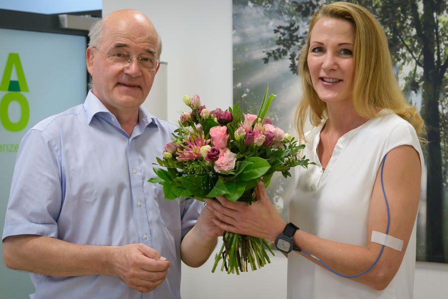 Mit einem Blumenstrauß bedankte sich Prof. Klaus Berger bei Kathleen Keuthage, die nun als 10.000ste Probandin aus Münster an NAKO-Gesundheitsstudie teilnahm (Foto: FZ / Erk Wibberg)