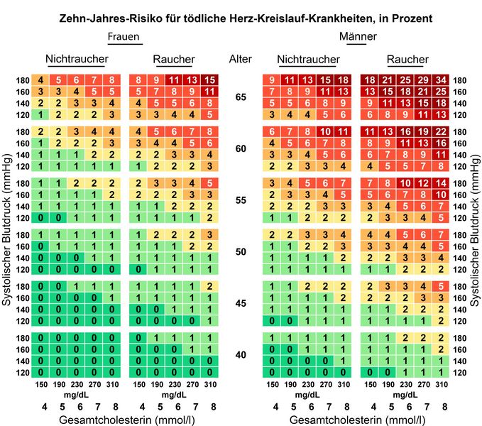 Ein Beispiel: Ein 60 Jahre alter Raucher mit hohem Cholesterinspiegel (310 mg/dL) und hohem Blutdruck (180 mmHg) hat ein Risiko von 22 Prozent, binnen zehn Jahren an einer Herz-Kreislauf-Krankheit zu sterben; das Tabellenfeld ist tiefrot. Das Risiko für einen gleichaltrigen Nichtraucher mit niedrigem Cholesterinspiegel (150 mg/dL) und niedrigem Blutdruck (120 mmHg) liegt bei nur zwei Prozent – ungewöhnlich niedrig für die Altersgruppe, in der Tabelle gelb hervorgehoben. Das Risiko tödlich verlaufender HKK ist bei Männern höher als bei Frauen, und mit dem Alter steigt es an. Dagegen sind wir machtlos. Aber: Unseren Blutdruck und unseren Cholesterinspiegel können wir durch einen gesünderen Lebensstil beeinflussen, und wer Zigaretten und Zigarren abschwört, hat bessere Karten für ein langes Leben.