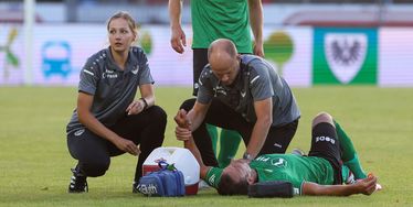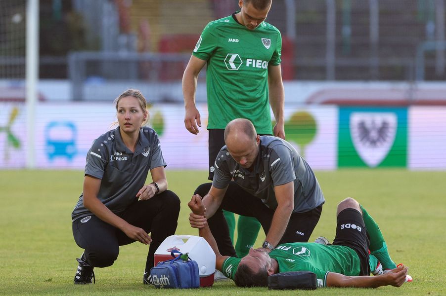 Gelungener Einstand: Bei Schneiders erstem Einsatz als Mannschaftsarzt von Preußen Münster durfte die Schulter nicht fehlen (Foto: Sebastian Sanders/Preußen Münster)