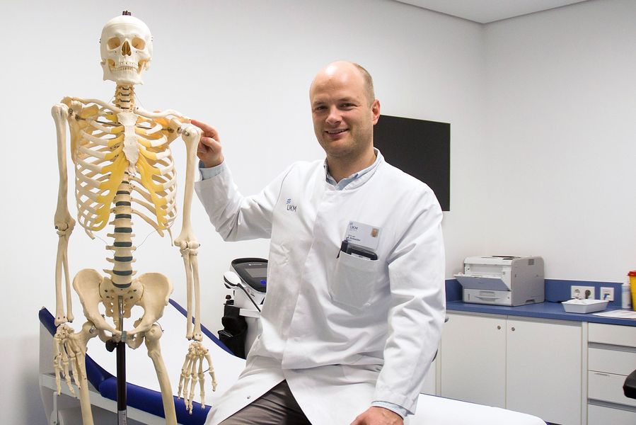 Münster (mfm/jg) - Welches Kind kennt das nicht? Sich voll Vorfreude die Fußballschuhe schnüren oder gebannt am Fernseher kleben und denken: Profi sein, das wär‘s doch. Prof. Kristian Schneider ist einer. Im weißen Kittel sitzt der 36-jährige Oberarzt der münsterschen Uniklinik für Orthopädie und Unfallchirurgie auf der Krankenliege, hält ein Skelett-Modell in den Händen und erklärt mit ruhiger Stimme, was es mit seinem Promotionsthema, der Schultereckgelenkssprengung, auf sich hat. „Das Gelenk verbindet Schlüsselbein mit Schulterdach, einem Teil des Schulterblatts“, sagt er, deutet zielsicher auf die betreffende Stelle. „Wenn man beim Radfahren oder Fußball mit angelegtem Arm stürzt, kann es sein, dass durch den Druck das feine Gelenk platzt“, so der Mediziner, dessen Karriere an „seiner“ jetzigen Uni begann.