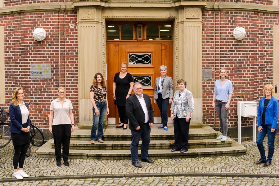 Auch Dekan Prof. Frank Ulrich Müller unterstützt das neue Netzwerk WiSNetMed, zu dem sich Vertreterinnen mehrere Forschungsverbünde zusammengefunden haben (v.l.n.r.: Dr. Cristin Beumer, Prof. Sonja Ständer, Prof. Ursula Rescher, Prof. Petra Dersch, Dr. Blass-Kampmann, Prof. Petra Scheutzel, Dr. Linda Brunotte, Dr. Nicole Finocchiaro) (Foto: WWU/E. Wibberg)