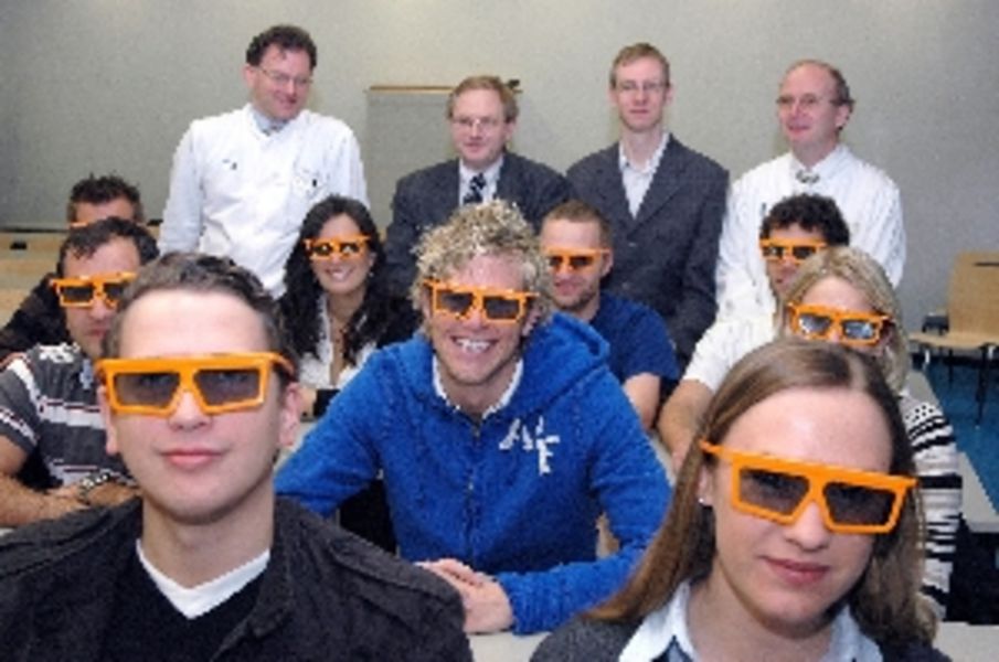 Unterstützung bekam der Hochschullehrer von dem in derselben Klinik tätigen Physiker PD Dr. Dieter Dirksen, dessen Spezialgebiet die Optik ist. Gemeinsam mit weiteren Wissenschaftlern entwickelten die beiden Projektinitiatoren „StePDent“, die „Stereoskopische Projektion in der Zahnmedizin“. Die Forschungswerkstätten der Fakultät bauten nach ihren Entwürfen ein Präsentationssystem, das nun - vor über 50 überraschten Studierenden – seinen Ersteinsatz in der Prothetik-Vorlesung hatte. „Das verwendete Verfahren ähnelt dem in den Kinos“, sagt Dr. Dirksen. Zwei Einzelbilder werden gleichzeitig auf eine spezielle Leinwand projiziert, wobei Filter zwischen Projektor und Leinwand das Licht der beiden Bilder unterschiedlich polarisieren. Für den dreidimensionalen Eindruck benutzen die Betrachter die aus Kinos bekannten Brillen mit Polarisationsfiltern.
