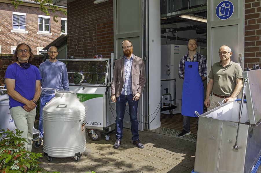 Das – auf dem Bild nicht vollzählige – Team der ZBB vor dem Freezer-Lager in der Domagkstraße (v.l.nr.): Dr. Lorenz Dobler, Dr. Christoph Stork, Dr. Tobias Brix, Sven Lemke und Prof. Klaus Berger (Foto: M. Kalic)