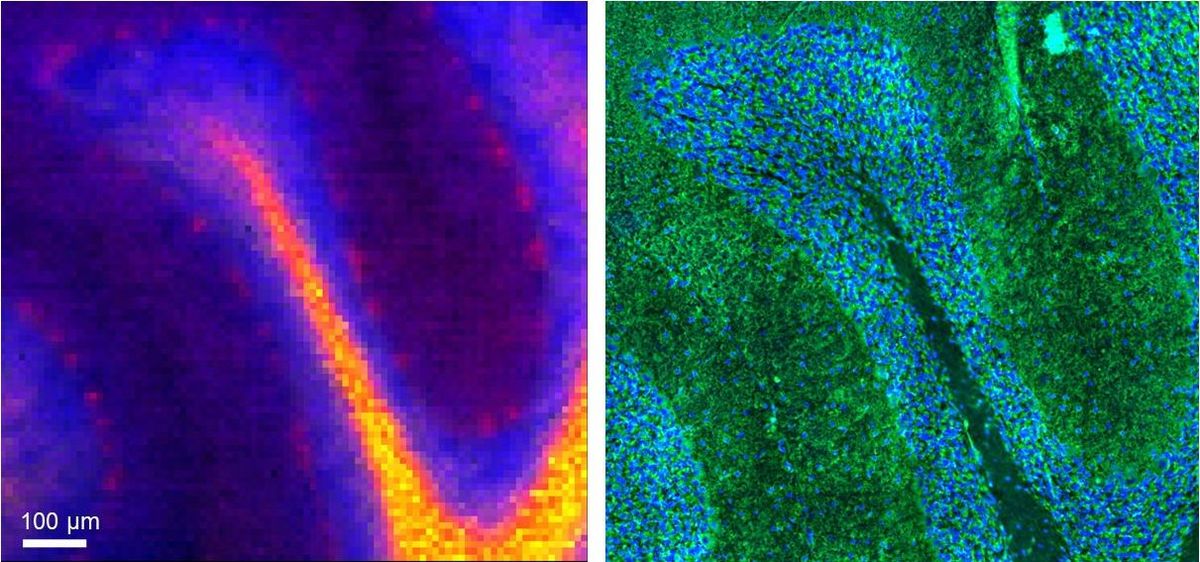 Links: Verteilung von drei verschiedenen Zellmembranbestandteilen (Membranlipide) in einer Probe aus dem Kleinhirn der Maus bei einer Pixelgröße von 10 µm (= 10 Tausendstel Millimeter), gemessen mit einem Massenspektrometer des Typs „timsTOF fleX MALDI-2“. Rechts: Fluoreszenzmikroskopie derselben Probe, aufgenommen vor der MALDI-Untersuchung. In blau dargestellt die Zellkerne und in grün ein Strukturprotein (Abb.: Uni MS/ AG Biomedizinische Massenspektrometrie)