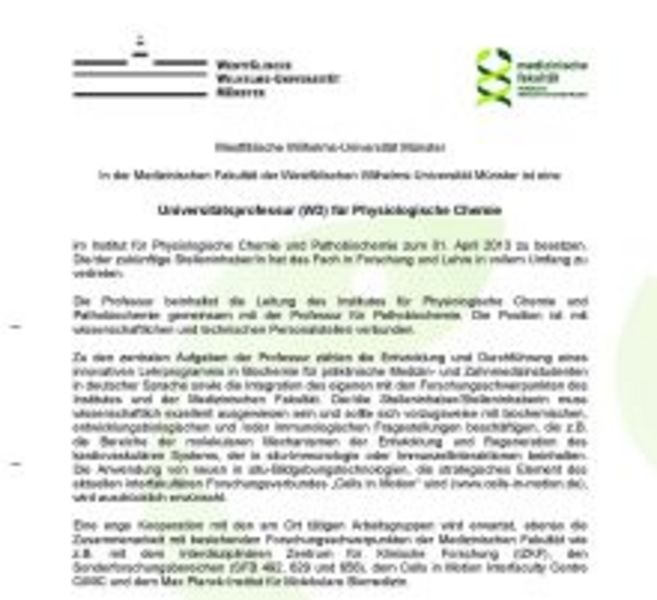 Münster (mfm) - Im Institut für Physiologische Chemie und Pathobiochemie ist zum 1. April 2013 eine Universitätsprofessur (W3) zu besetzen. Sie beinhaltet die Leitung des Institutes gemeinsam mit der Professur für Pathobiochemie. Die Position ist mit wissenschaftlichen und technischen Personalstellen verbunden.