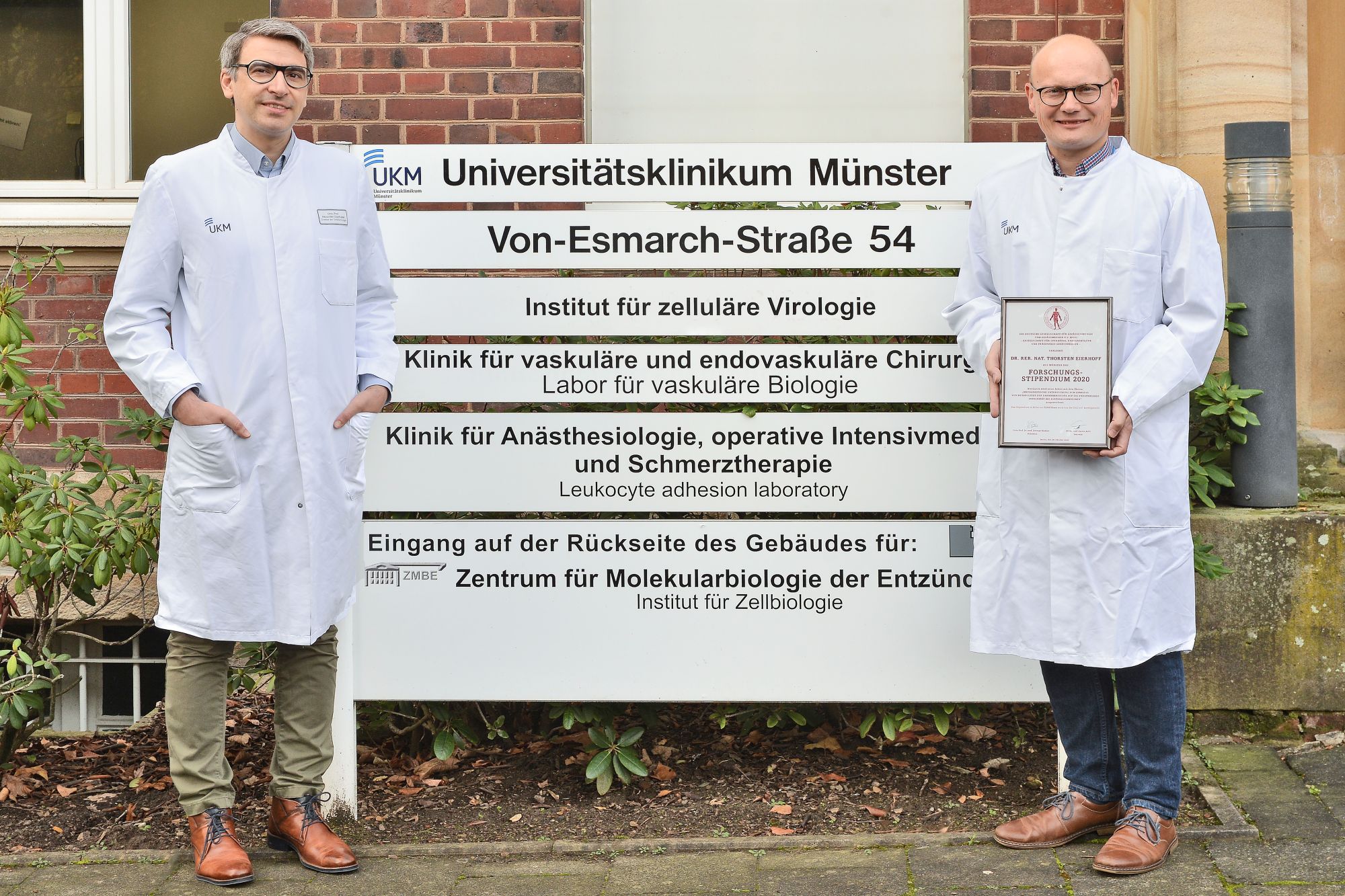 Münster (mfm/sw) – Drei Auszeichnungen für den Nachwuchs der Gefäßchirurgie der Westfälischen Wilhelms-Universität (WWU) Münster: Sowohl Dr. Abdulhakim Ibrahim, Gefäßchirurg und Oberarzt, als auch Doktorand Paul Stammer aus der Uniklinik für Vaskuläre und Endovaskuläre Chirurgie konnten von der Jahrestagung der Deutschen Gesellschaft für Gefäßchirurgie und Gefäßmedizin (DGG) einen Preis mit nach Haus nehmen. Stammer erhielt den MaGiC-Award, mit dem der wissenschaftliche Nachwuchs der DGG ausgezeichnet wird, Ibrahim erhielt für seine Arbeiten einen Posterpreis. Auch die interdisziplinäre Zusammenkunft der Gefäßmedizin das „Basic Vascular Science-Meeting“, ist auf Stammers Forschung aufmerksam geworden – und zeichnete diesen auf dem jährlichen Treffen in Leiden/Niederlande ebenfalls mit einem Posterpreis aus.