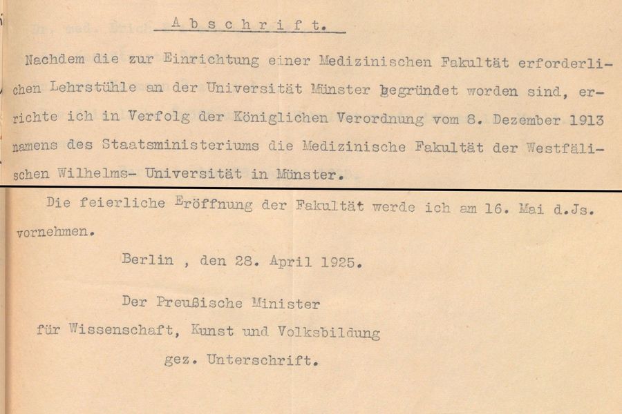 Am 28. April dieses Jahres verfügte Minister Carl Heinrich Becker, dass er, nachdem die notwendigen Lehrstühle eingerichtet wurden, die Medizinische Fakultät der Universität Münster errichte – und zwar „in Verfolg der Königlichen Verordnung vom 8. Dezember 1913“. Geplant war die Einrichtung nämlich schon länger - der Erste Weltkrieg hatte die Erweiterung der Hochschule um das Fach Medizin um mehr als zehn Jahre verzögert. Für den 16. Mai 1925 kündigte Becker die „feierliche Eröffnung der Fakultät“ an.