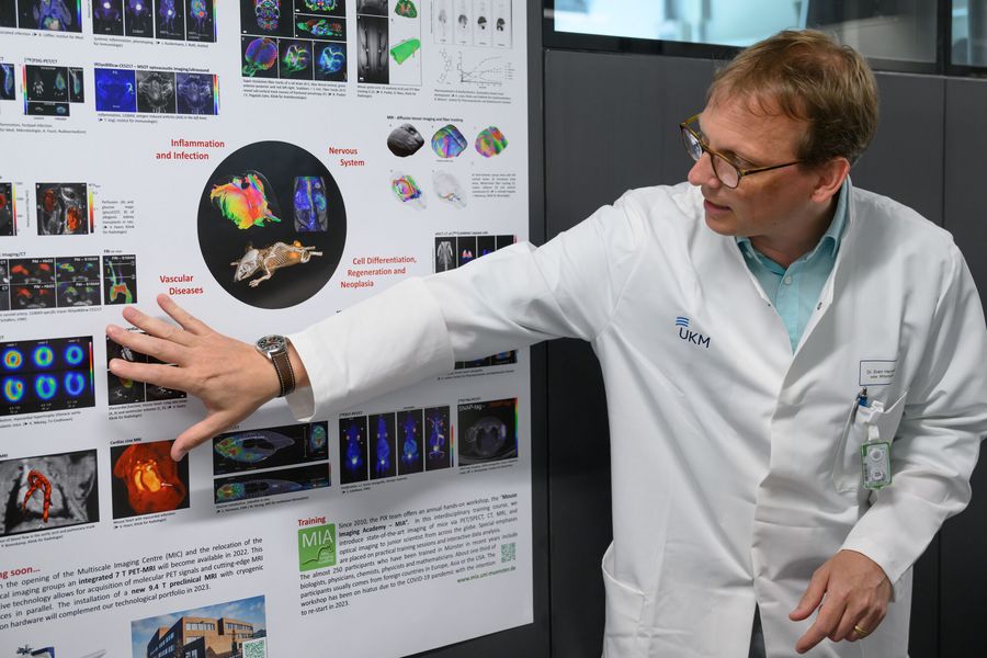 „Das Gebäude ist europaweit ein Leuchtturmprojekt. Wir kombinieren bildgebende Verfahren von der Mikroskopie bis zur Ganzkörper-Bildgebung in einer interfakultären Zusammenarbeit. Das ermöglicht uns die Erforschung von dynamischen Zellprozessen auf unterschiedlichen Skalen: von der einzelnen Zelle über Gewebestrukturen bis hin zu Organen und dem ganzen Körper“, erklärt Prof. Michael Schäfers, Nuklearmediziner und Sprecher des MIC, die Einzigartigkeit des Forschungsbaus. „Eine weitere Besonderheit ist, dass wir die Zellbewegungen in zeitlichen Varianzen, etwa Minuten, Stunden, Tagen oder Wochen, mit speziellen Bildgebungsverfahren sichtbar machen können.“ Das Ganze erfolgt in vivo – also am lebenden Organismus.
