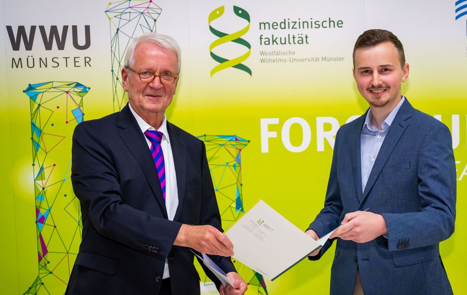 Münster (mfm/jg) – Bahn frei - Immunzelle im Einsatz: Auf ihrem Weg zu Entzündungen müssen Abwehrzellen wie die Monozyten auch gefäßauskleidende Zellen mit einer Proteinmembran überwinden. Wie die Monozyten die hierfür notwendigen Kräfte aufbringen und koordinieren können, hat Dr. Hendrik Schürmann in seiner Doktorarbeit untersucht. Die Medizinische Fakultät der Universität Münster würdigte die Arbeit jetzt mit ihrem mit 1.000 Euro dotierten Promotionspreis.