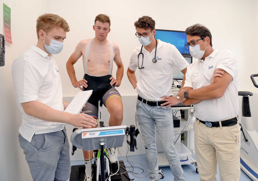 Das Institut für Sportmedizin des UKM (Universitätsklinikum Münster) fährt diese Woche unter internationaler Flagge. Denn mit dem Team Trek-Segafredo sind insgesamt 16 Radsportprofis aus Dänemark, Belgien, Luxemburg und den Niederlanden zu Gast, um sich für die bevorstehende Saison durchchecken zu lassen. Unter ihnen: Mads Pedersen, amtierender Straßenweltmeister und damit eines der aktuellen Aushängeschilder des Profi-Radsports. Sie alle durchlaufen ein umfangreiches Programm, was von der Messung allgemeiner körperlicher sowie Blut-Parameter über Lungenfunktionstests und Echokardiographie des Herzens bis zu Ausbelastungstests reicht. „Auch, wenn diese Testungen unser täglich Brot sind, ist solch eine Mannschaft natürlich etwas Besonderes für uns, das ist Champions-League-Niveau“, sagt Prof. Dr. Dr. Stefan-Martin Brand. Die Begeisterung ist dem Direktor des Instituts und seinem Team anzusehen, akribisch haben sie sich auf diese Woche vorbereitet.