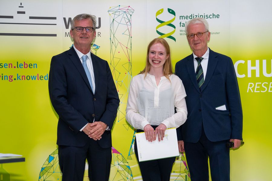 Geboren und aufgewachsen in Soest, zog die 26-Jährige für ihr Medizinstudium in die westfälische Metropole – nach Münster. Nach Approbation und Promotion hält es Dr. Amélie Menke weiter in ihrer Wahlheimat, wo die junge Preisträgerin nun als Assistenzärztin in der Medizinischen Klinik D der Uniklinik tätig ist. Für die am Institut für Translationale Neurologie unter Begleitung von Doktorvater Prof. Sven Meuth verfasste Studie gab es nicht nur die Bestnote „summa cum laude“, sondern als Draufgabe auch noch einen Geldpreis von 1.000 Euro. Die Dotierung des Promotionspreises übernimmt der Verein der emeritierten Professorinnen und Professoren der Medizinischen Fakultät, für den der Onkologe Prof. Heribert Jürgens an der Feier teilnahm.