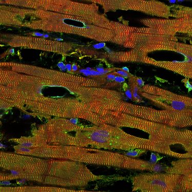 Das Bild zeigt das Herzgewebe einer an der dilatativen Kardiomyopathie erkrankten Person. Die Rotfärbung zeigt Titin, die Grünfärbung einen anderen Marker der kontraktilen Einheiten (Alpha-Aktinin), die Blaufärbung die Zellkerne. Die Löcher deuten auf die beginnende Zerstörung des Gewebes hin (Copyright: AG Linke)