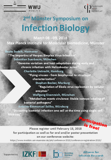 Der phi – Pathogen-Host Interplay Club veranstaltet das "2. Münster Symposium of Infection Biology" am Max-Planck-Institut für Molekulare Biomedizin, Münster vom 08. - 09.03.2018. Die Anmeldung zum Symposium ist freigeschaltet. Bitte melden Sie sich HIER bis zum 13.02.2018 an. Weitere Details zum Symposium finden Sie hier phi – Pathogen-Host Interplay Club