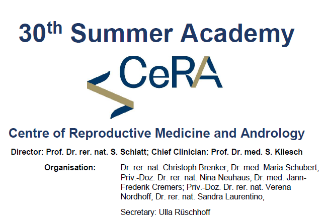 Die Sommer Akademie des CeRA findet dieses Jahr vom 23. bis zum 27. August statt. Gemeinsam mit der European Academy of Andrology (EAA) wird der Workshop für Studierende der Biologie, der Biochemie, der klinischen und veterinären Medizin und für Postdoktoranden der Medizin und verschiedener Naturwissenschaften angeboten. Dabei geht es um die Grundlagen und Klinik der menschlichen Reproduktion.