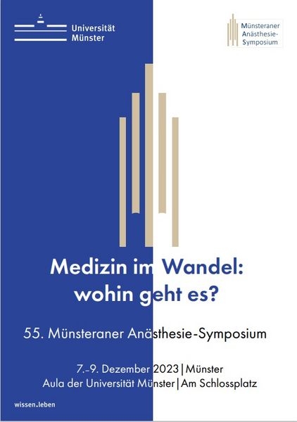 Vom 07.-09.12.2023 veranstaltet der Wissenschaftliche Kreis der Klinik für Anästhesiologie, operative Intensivmedizin und Schmerztherapie der Universität Münster e.V. das 55. Münsteraner Anästhesie Symposium. Nach der letztjährigen Durchführung unseres Symposiums im Online-Format freuen wir uns ganz besonders Sie 2023 wieder als Gäste vor Ort in Münster begrüßen zu dürfen! Das diesjährige Leitthema „Medizin im Wandel: wohin geht es?“ spricht sicherlich vielen von uns aus dem Herzen. Wir erleben als Akteure im Gesundheitssystem in den letzten Jahren, nicht erst seit der Pandemie, eine Zeit des Umbruchs. Ressourcen werden knapp, die kontinuierliche Verfügbarkeit von Materialien und Medikamenten ist längst nicht mehr so selbst selbstverständlich wie wir es vielleicht gewohnt waren und nicht zuletzt das gewichtige Problem der Personalknappheit im Krankenhaussektor sind mittlerweile zu ganz realen Alltagsproblemen geworden. Die Anästhesie und Intensivmedizin steht hier sicherlich als ganz zentraler Akteur im Krankenhausbetrieb in vorderster Front und erlebt die Auswirkungen dieser neuen Realität ungefiltert mit. Auch unser Fach muss und wird sich diesen Herausforderungen stellen. Hierbei hilft es sich fortwährend bewusst zu machen, in welcher Weise sich die Medizin verändert und wohin die Reise geht. Das diesjährige Münsteraner Anästhesie Symposium 2023 wird hierzu durch vielfältige Beiträge zu Themen aus den Bereichen Anästhesie, Intensivtherapie und Schmerzmedizin neue Sichtweisen auf ganz aktuelle Thematiken der perioperativen Medizin eröffnen