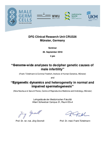 PD Dr. Nina Neuhaus will present her work with Dr. Sara di Persio about 'Epigenetic dynamics and heterogeneity in normal and impaired spermatogenesis'. Prof. Dr. Frank Tüttelmann will talk about 'Genome-wide analyses to decipher genetic causes of male infertility' together with Dr. Corinna Friedrich.