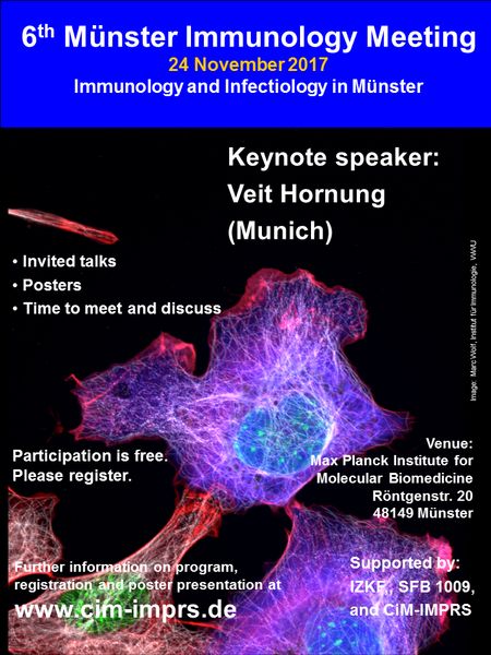 Am 24. November findet das 6. Münster Immunology Meeting im Max Planck-Institut für Molekulare Biomedizin, Röntgenstraße 20 statt. Das Meeting soll eine Plattform für den wissenschaftlichen Austausch von Postdocs und PhD/Master-Studenten darstellen, die sich für aktuelle Fragestellungen aus dem Gebiet der immunologischen Forschung interessieren. Es wird von der internationalen Graduiertenschule CiM-IMPRS organisiert mit Unterstützung des Sonderforschungsbereichs (SFB) 1009 ‚Breaking Barriers‘ und IZKF Münster.