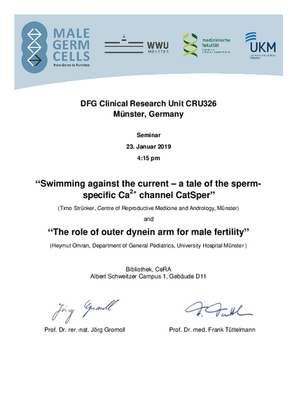 Prof. Dr. Omran, Chief Medical Director of the Department of Genereal Pediatrics at the University Hospital Münster, Germany will talk about 'The role of outer dynein arm for male fertility' and Prof. Dr. Strünker, Head Researcher of Molecular Reproductive Physiology at the CeRA in Münster, Germany will tell an exciting story about 'Swimming against the current - a tale of the sperm-specific Ca2+channel CatSper'.