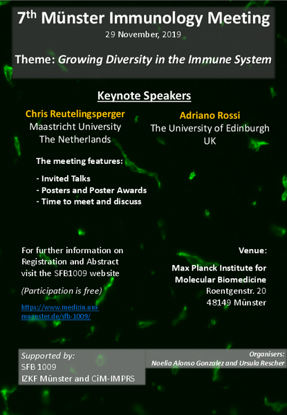 Am 29. November findet das 7. Münster Immunology Meeting im Max Planck-Institut für Molekulare Biomedizin, Röntgenstraße 20 statt. Das Meeting soll eine Plattform für den wissenschaftlichen Austausch von Postdocs und PhD/Master-Studenten darstellen, die sich für aktuelle Fragestellungen aus dem Gebiet der immunologischen Forschung interessieren. Es wird vom Sonderforschungsbereichs (SFB) 1009 ‚Breaking Barriers' mit Unterstützung der internationalen Graduiertenschule CiM-IMPRS und IZKF Münster, organisiert.