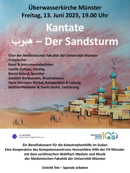 Am 13. Juni 2025 um 19:00 Uhr findet in der Überwasserkirche das Benefizkonzert “Sandsturm” für die Katastrophenhilfe im Sudan statt. Eine Kooperation des Kompetenzzentrums Humanitäre Hilfe der FH Münstermit dem vorklinischen Wahlfach Medizin und Musik der Medizinischen Fakultät der Universität Münster.