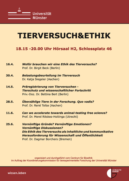 Die Ringvorlesung wird organisiert und durchgeführt vom Centrum für Bioethik im Auftrag der Koordinierungskommission für tierexperimentelle Forschung der Universität Münster Die einzelnen Termine finden jeweils dienstags von 18.15-20.00 Uhr im Hörsaal H2, Schlossplatz 46 in Münster statt. Alle Interessierten sind eingeladen, eine Anmeldung ist nicht erforderlich, der Eintritt ist frei.