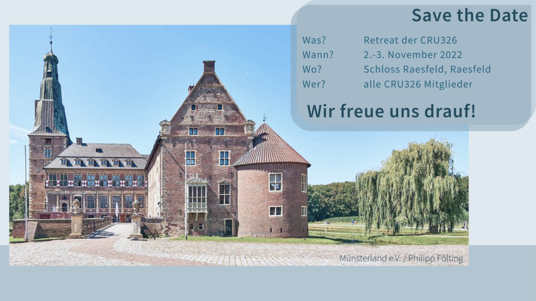 Nach einer beinahe endlosen Zeit von virtuellen Meetings und Social Distancing, gibt es nun wieder die Möglichkeit, sich im schönen Schloss Raesfeld miteinander persönlich auszutauschen und zu vernetzen. Während des Retreats werden neue wissenschaftliche Erkenntnisse und Projektentwicklungen vorgestellt und diskutiert, um potenzielle weitere Interaktionen von CRU Projekten zu ermöglichen.