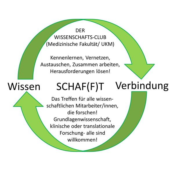 Forschung ist ein Schwerpunkt der Medizinischen Fakultät. Exzellente Forschungsgruppen sind am Standort Münster tätig. Doch die Details, wer an welchen Themen arbeitet oder wer über welche Methoden verfügt, sind selten bekannt. Der Wissenschafts-Club möchte Vernetzungen zwischen den Arbeitsgruppen sowie Kollaborationen fördern. Der Fokus liegt auf der Unterstützung jeglicher Art von Forschung und der Erhaltung der exzellenten Forschungskultur und Produktivität der Medizinischen Fakultät bzw. des UKM.