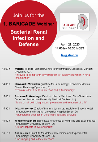 Termin aus dem Bereich HygieneFOR 5427 1. BARICADE webinar: Bacterial Renal Infection and DefenseBARICADE FOR 5427 The webinar is free of charge: RegistrationWebinar schedule Termin in lokalen Kalender importieren