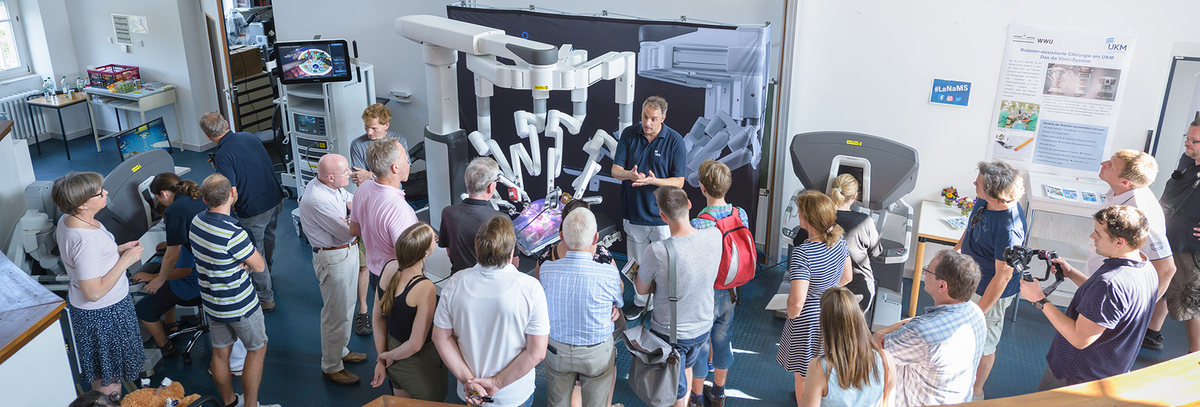 Die Klinik für Allgemein-, Viszeral- und Transplantationschirurgie läd herzlich zur diesjährigen Langen Nacht der Robotikein: Im Hörsaal der Chirurgie präsentiert das Team des Robotik-Zentrums die neueste Generation Operationsroboter zum Anfassen. An einem vollständigen da Vinci Xi-System mit Doppel-Konsole führen wir Live-Übertragungen von unblutigen Kuscheltier-Operationen direkt vor Ort durch. Expert*innen demonstrieren, wie eine Weintraube oder eine Tomate geschält und anschließend wieder zusammengenäht werden. Wie bereits in den vergangenen Jahren kann jede*r und vor allem jedes Kind selbst einmal die Joysticks bedienen und den Roboter unter Anleitung steuern. An einer weiteren Roboter-Konsole können die Gäste am da Vinci-Simulator üben und sich in unterschiedlichen Schwierigkeitsgraden beweisen. Kleine Operationen können durch unsere Gäste selbst in der Simulation durchgeführt werden. Dazu informieren Poster und Kurzvorträge im Hörsaal. Wir freuen uns auf Ihr und Euer Kommen! Impressionen der Langen Nacht der Robotik 2022 finden Sie hier.