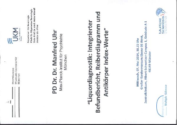 Am Mittwoch, 7. Mai 2014, hält PD Dr. Hans Lange vom Max-Planck-Instiut für Psychiatrie in München einen Vortrag um Thema "Liquordiagnostik: Integrierter Befundbericht, Reiberdiagramm und Antikörper-Index-Werte". Die Veranstaltung beginnt um 18:15 Uhr im Zentralklinikum, großer Konferenzraum Ebene 05 West, Raum 05.603. Sie ist von der Ärztekammer Westfalen-Lippe mit zwei Fortbildungspunkten zertifiziert.