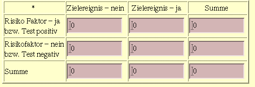 Um Werte in die Eingabefelder der Vierfeldertafel einzugeben, klicken Sie dazu mit der linken Maustaste in das entsprechende Fenster, lassen den Mauszeiger in dem Fenster, löschen mit der Backspace-Taste (<--) die alten Werte und geben mit der Tastatur die gewünschten neuen Werte ein. Nach Eingabe des letzten Wertes sollte die Return-Taste (<--|) gedrückt werden, damit die korrekten Zeilen- und Spaltensummen ermittelt werden. Die Eingabe der vier Häufigkeiten 80,120,110,90 bewirkt die folgende Kontingenztafel: