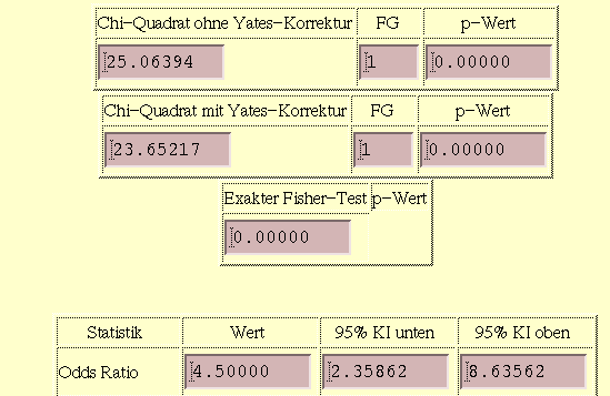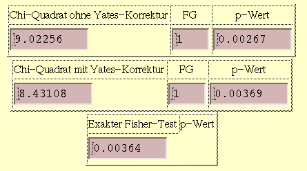 Nach Anklicken der Leiste "Berechne" erscheint das folgende Ergebnis des Chi-Quadrat-Tests und des exakten Fisher-Tests.