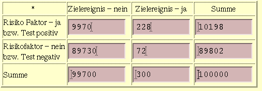 Zur Erkennung einer bestimmten Krankheit A werde ein diagnostischer Test auf 100000 Personen angewendet. Von den 100000 Personen seien 300 an A erkrankt. Von den 300 Erkrankten haben 228 einen positiven Test und 72 einen negativen Test. Dies führt zu folgender Vierfeldertafel.