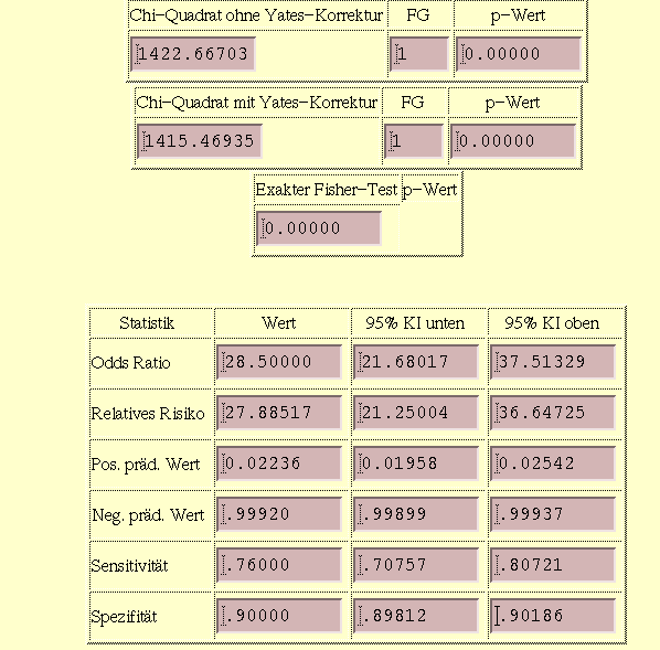 Nach Anklicken der Leiste "Berechne" erscheint das folgende Ergebnis für die Güte des Diagnostischen Tests. Zusätzlich zu den Kenngrößen werden noch die unteren bzw. oberen Grenzen des zugehörigen 95%-Konfidenzintervall ausgegeben.