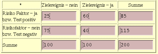 In einer Fall-Kontroll-Studie sind bei 100 Lungenkrebsfällen 60 Raucher. Von den 100 Kontrollen sind dagegen nur 25 Raucher. Dies führt zur folgenden Vierfeldertafel.