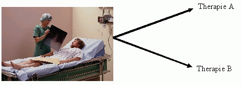 In einer Klinischen Studie zur Behandlung der AML soll die remissionserhaltende Wirkung zweier Therapien A und B verglichen werden. Zielgröße ist die rezidivfreie Überlebenszeit nach Erreichen der ersten Remission. Sobald sich ein an AML erkrankter Patient bereit erklärt hat, an der Studie teilzunehmen, wird ihm eine der beiden Faktorstufen (Therapie A bzw. B) zufällig zugeteilt.