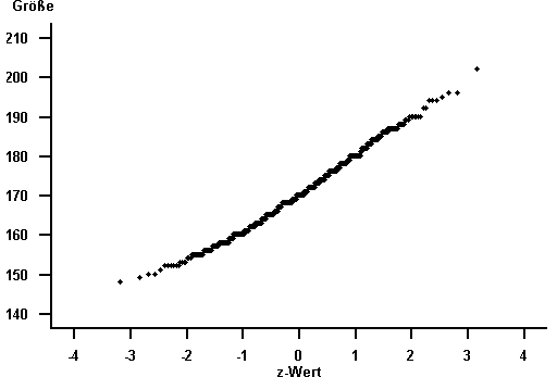 Der Normalverteilungsplot gibt annähernd eine Gerade wieder. Das Merkmal "Größe" kann als normalverteilt mit Erwartungswert 170 cm und Standardabweichung 9.4 cm angenommen werden.