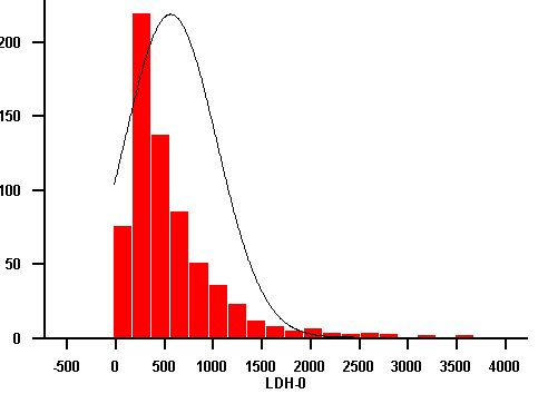 Abbildung 7.9: Histogramm mit angepasster Normalverteilungsdichte des Merkmals "LDH"