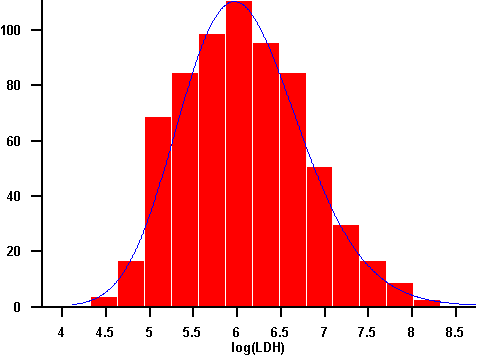 Median und Mittelwert unterscheiden sich beim "LDH" stark, sind aber annähernd gleich beim "log(LDH)". Auch das Histogramm zeigt beim "LDH" eine schlechte Übereinstimmung mit der angepassten Normalverteilungsdichte und eine gute Übereinstimmung bei den logarithmierten Werten.