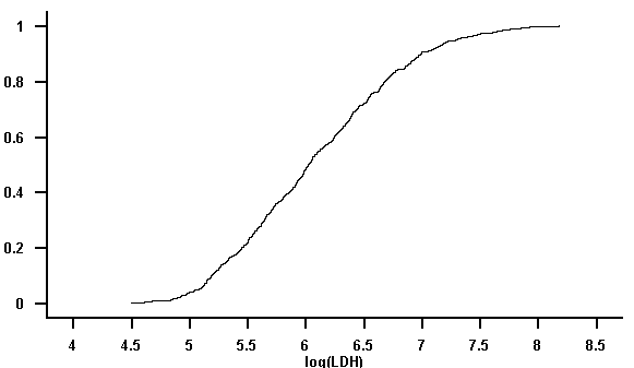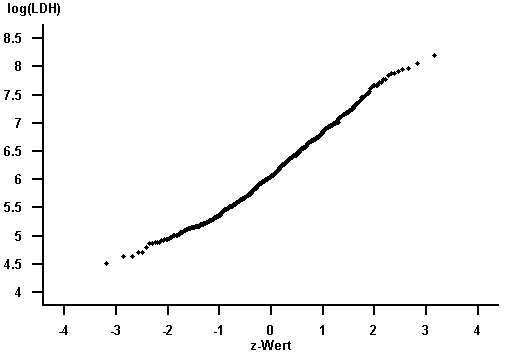 Die empirische Verteilungsfunktion zeigt für das "LDH" ebenfalls nicht die für die Normalverteilung typische sigmoide Form. Beim "log(LDH)" ist diese Form zu sehen.