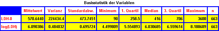 Abbildung 7.8: Basisstatistik des Merkmals "LDH und log(LDH)"