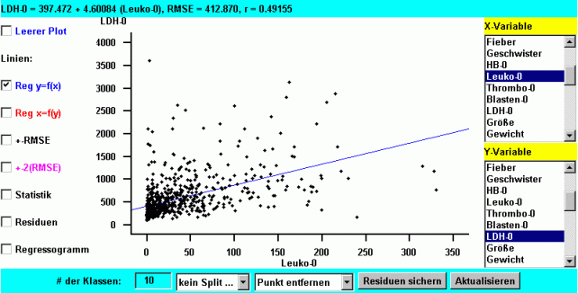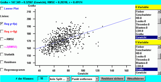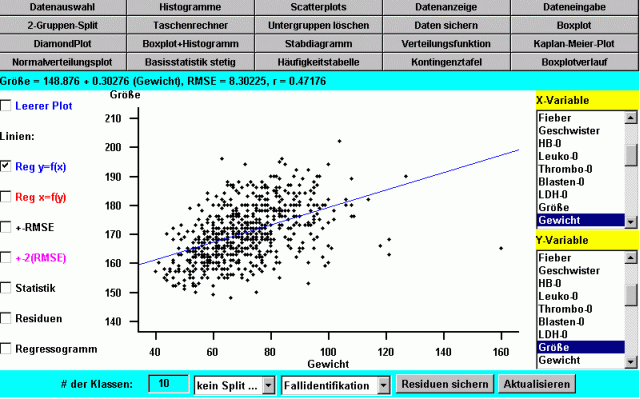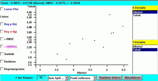 Wenn man an der rechten Seite die gewünschten Variablen markiert und die Leiste "Aktualisieren" anklickt, erhält man das gewünschte Ergebnis. Der Korrelationskoeffizient von r=0.47176 erscheint nach der Regressionsgleichung in der Ergebnisleiste über dem Scatterplot.