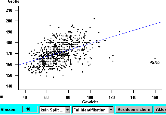 Wenn man mit der standardmäßig eingestellten Option "Fallidentifikation" den Ausreißer mit dem Gewicht von 160 kg anklickt, erscheint die Fallidentifikation "P5752".