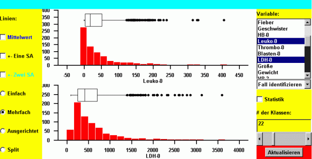 Wie man mit dem Modul "Boxplot+Histogramm" erkennt, sind die Merkmale "LDH" und "Leukozyten" beide stark rechtsschief (linksgipflig) verteilt.