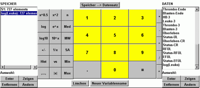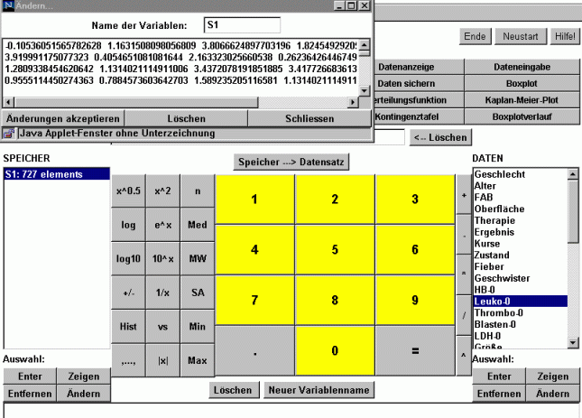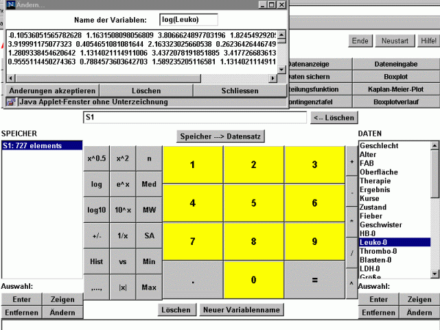 Nach Markieren der Variable "Leuko-0" und Anklicken der Tasten "Enter", "log" und "=", enthält die Speichervariable S1 die logarithmierten Leukozytenwerte. Nach Markierung auf der linken Seite und Anklicken der Leiste "Ändern" werden die transformierten Werte in einem separaten Fenster angezeigt.