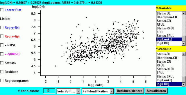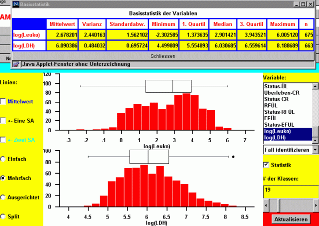 Analog kann man die Variable "LDH-0" transformieren. Wie man mit dem Modul "Boxplot+Histogramm" erkennt, sind die Merkmale "log(LDH)" und "log(Leuko)" annähernd symmetrisch verteilt.